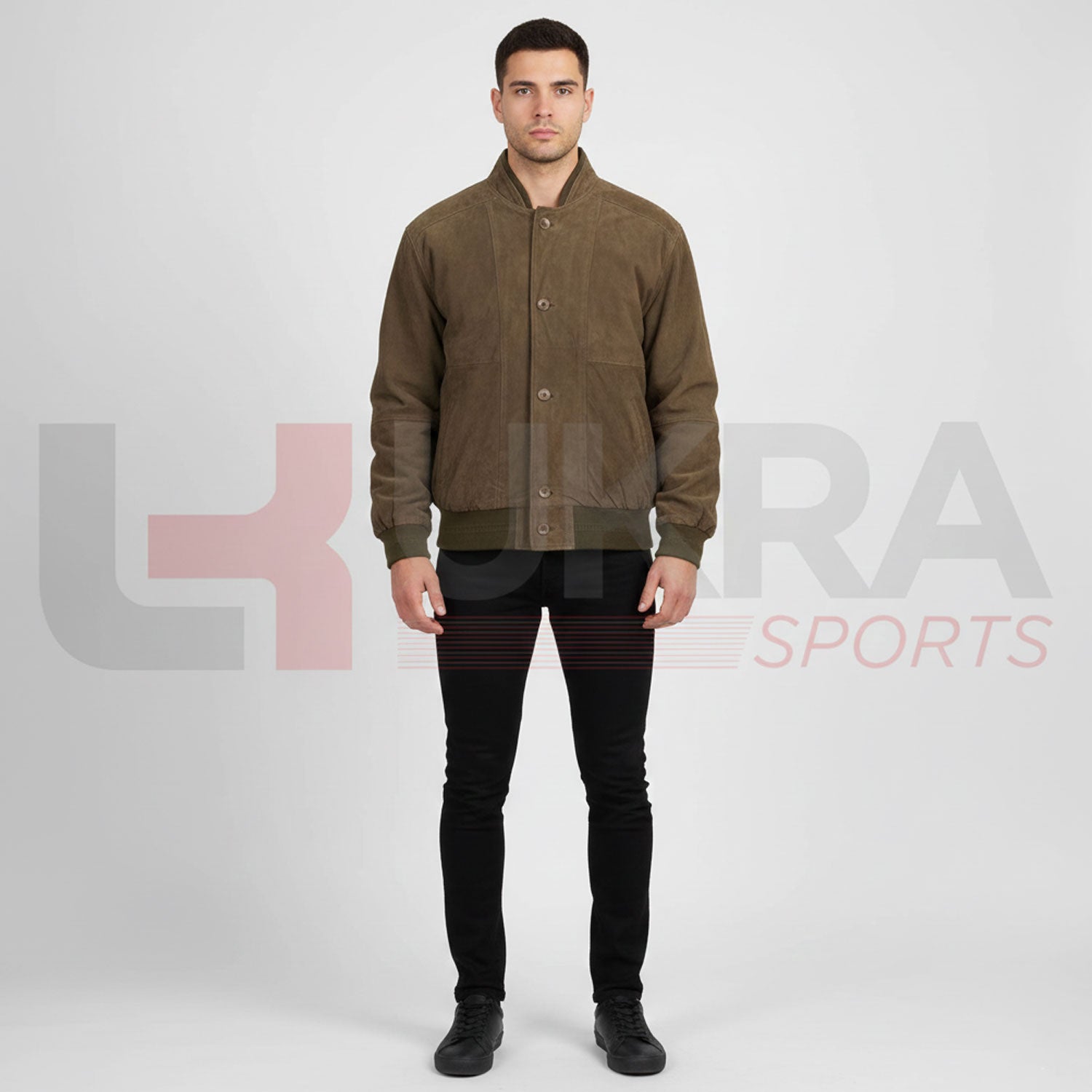 Premium suede varsity jacket in olive brown with button-down design and Italian craftsmanship — perfect for modern casual and elevated everyday style.